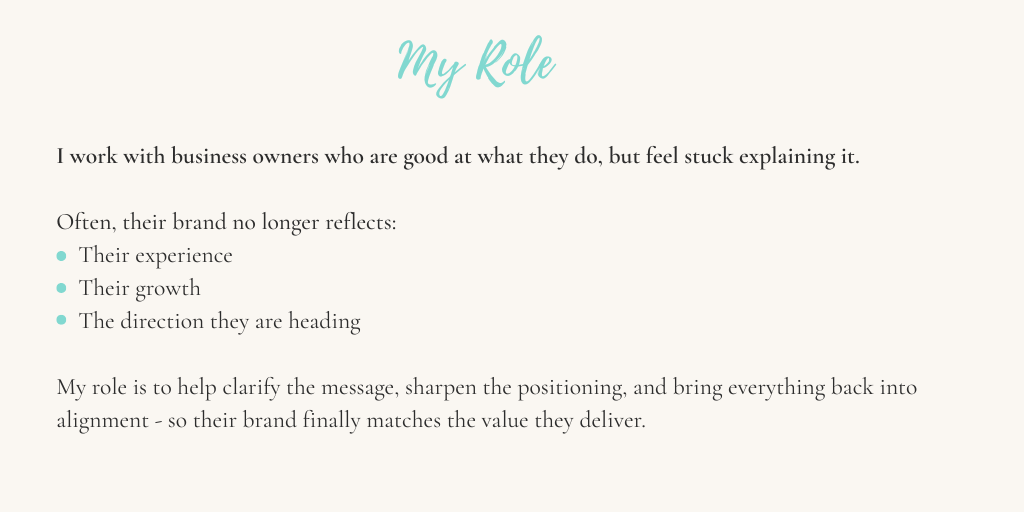 I work with business owners who are good at what they do, but feel stuck explaining it.My role is to help clarify the message, sharpen their positioning, braing everything back in alignment with the vision of their brand.